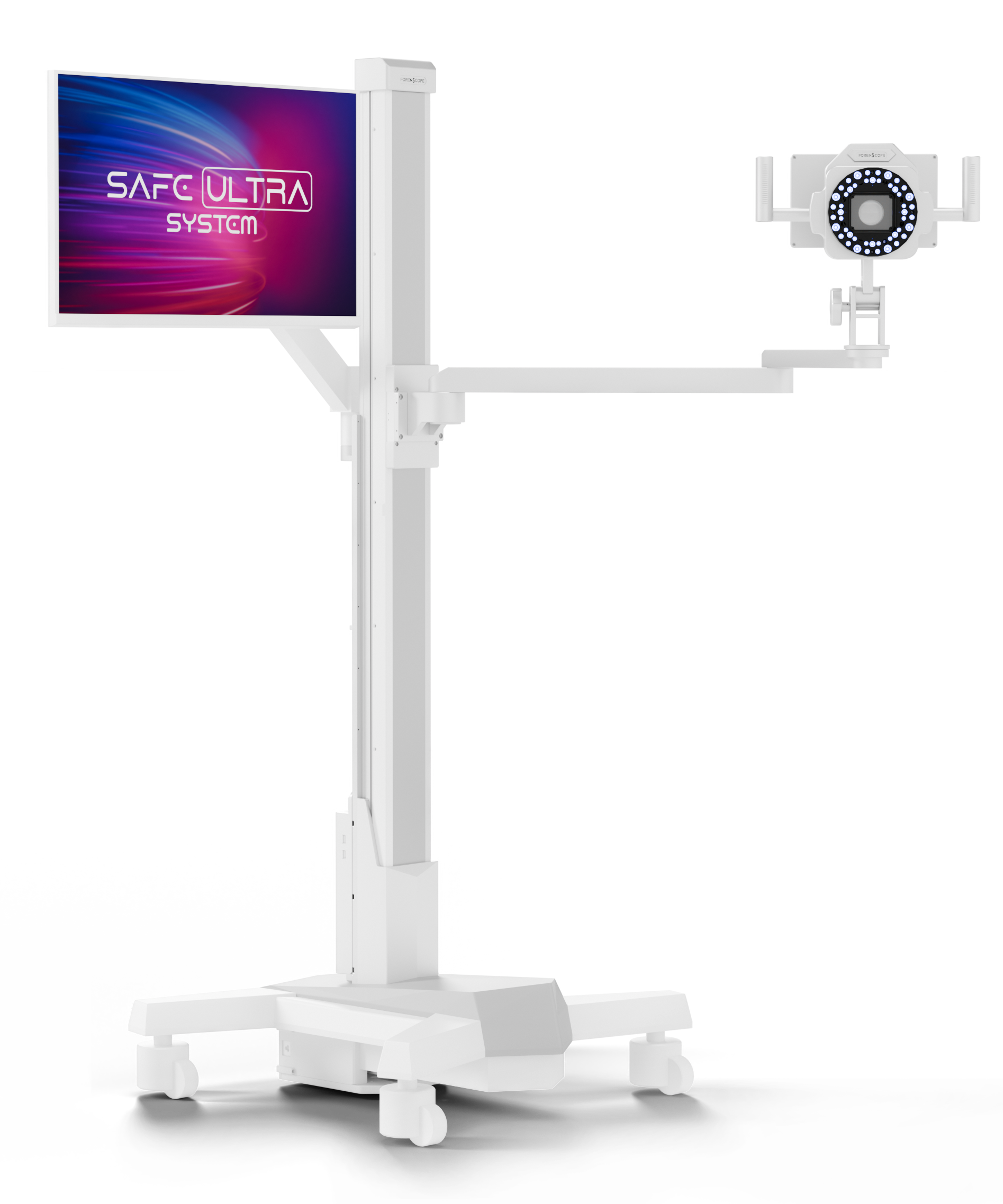 Key features include the ability to detect biological fluids (such as semen and saliva) on both skin and clothing from a distance, a 2K movable examination display for ergonomic use, and a dedicated Case Management System (CMS) that ensures evidence integrity and generates court-ready reports. Unlike traditional colposcopes, the SAFE ULTRA offers a contactless, non-invasive approach, prioritizing case comfort while maintaining a secure chain of custody for forensic data.